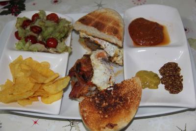 - Ponemos la carne de la hamburguesa, encima la lechuga con el beicon , el tomate, la cebolla, el huevo frito y el mollete.