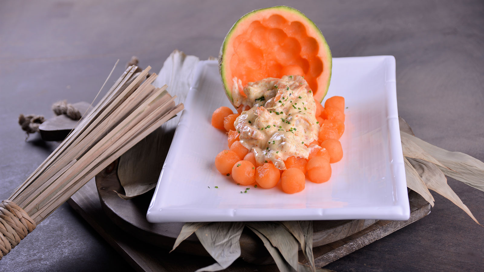 Langostinos con melón y mayonesa de ajo y shichimi
