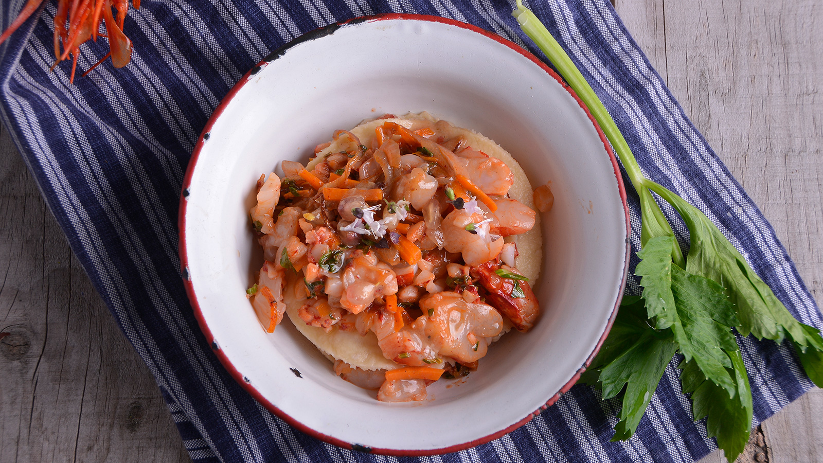 Cuando el sofrito esté listo, retiramos del fuego y le añadimos los carabineros troceados. Removemos rápidamente para evitar que se cocinen en exceso nuestro ragú de carabineros.