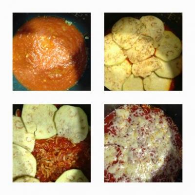 En el fondo de la cubeta ponemos una capa de salsa de tomate una segunda de berenjena y una tercera de carne picada (ponemos la mitad) y repetimos nuevamente terminando con una capa de salsa de tomate.