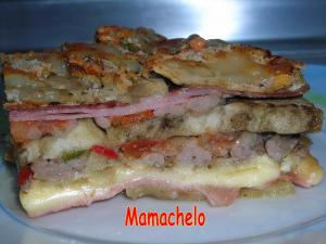 Primero una de berenjena, luego otra de york y queso, otra de berenjena, otra de jamón serrano, berenjena, carne picada.