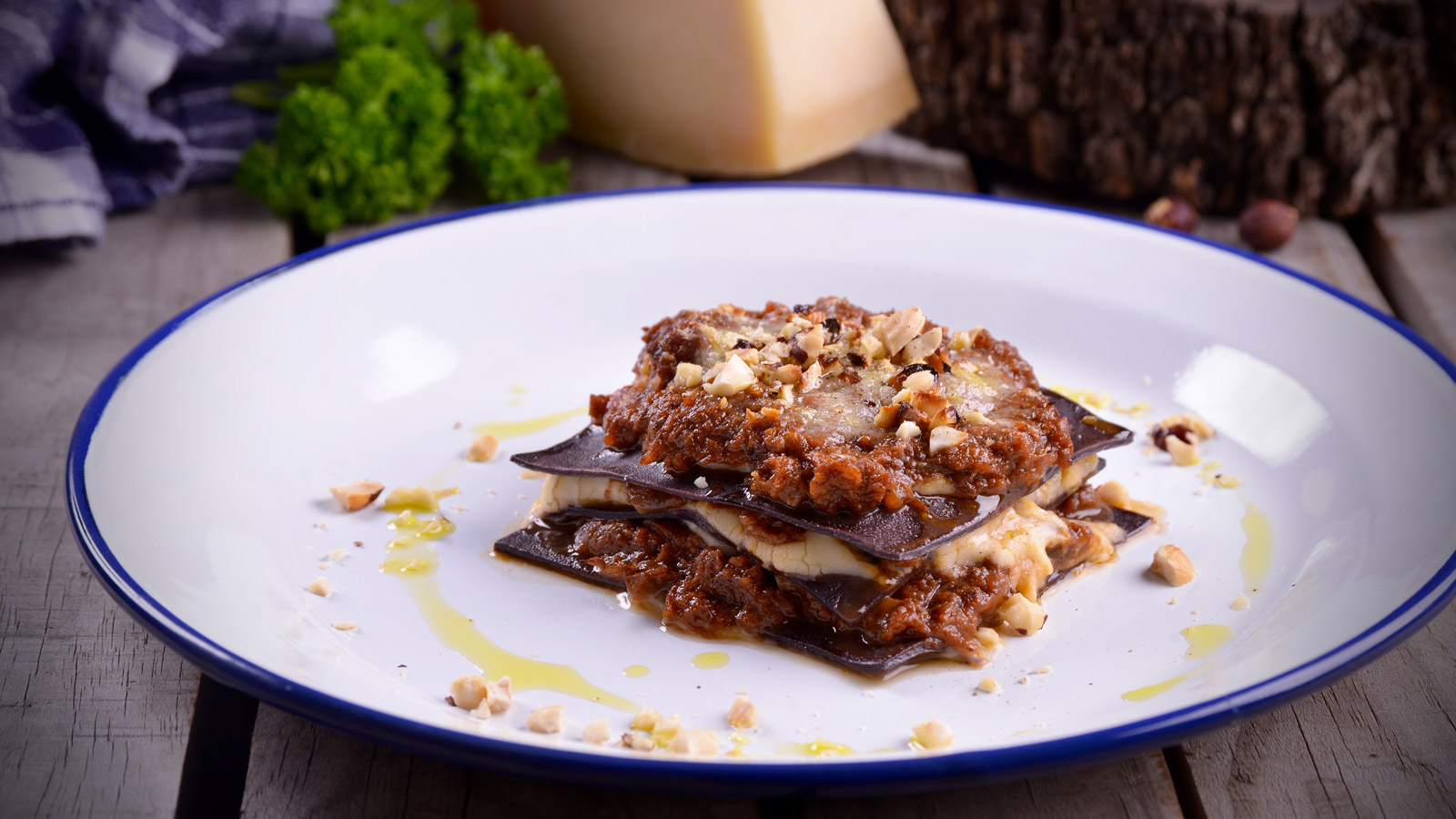 Lasaña de ragú de ciervo al cacao y bechamel de avellanas