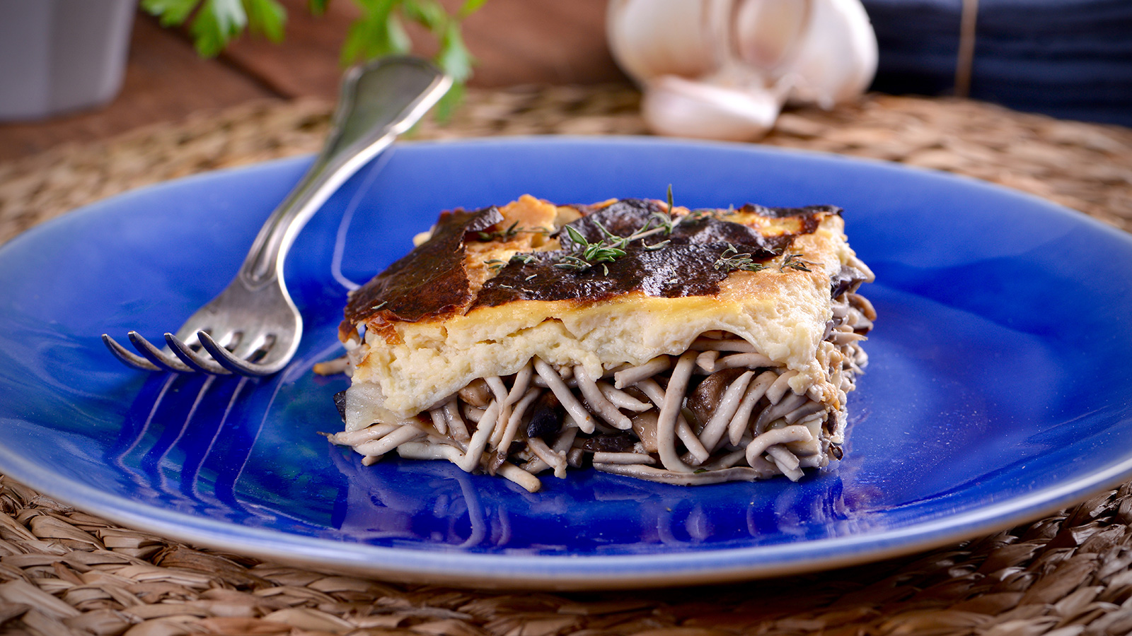 Lasaña de setas de temporada con sucedáneo de angulas