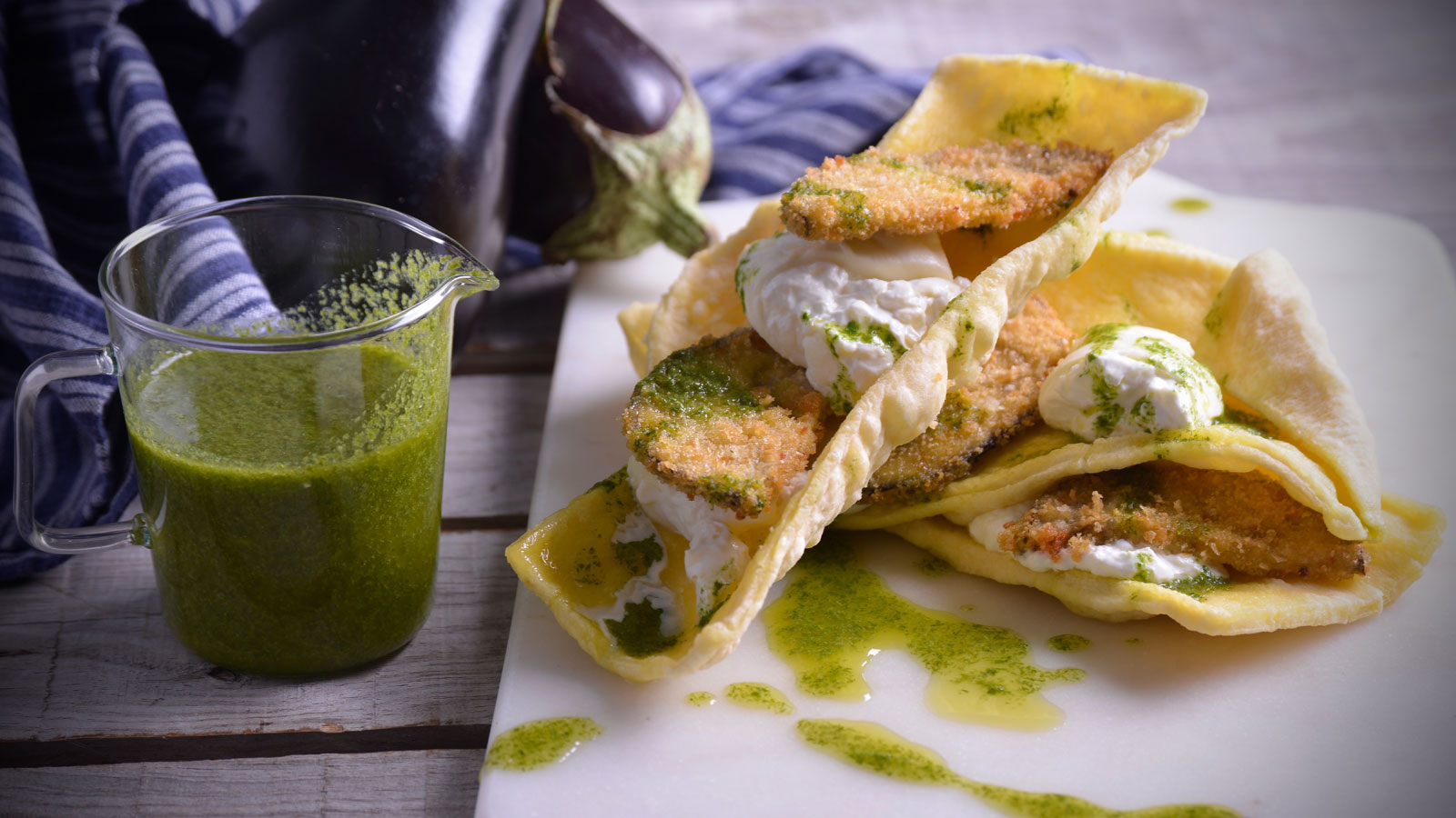 Lasaña frita de burrata y berenjenas