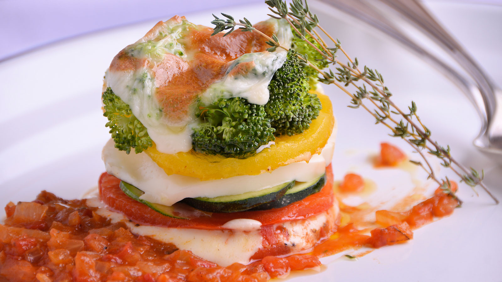 Montamos la lasaña intercalando capas de verdura, mozzarella y coronamos con un copete de brócoli y más queso mozzarella.