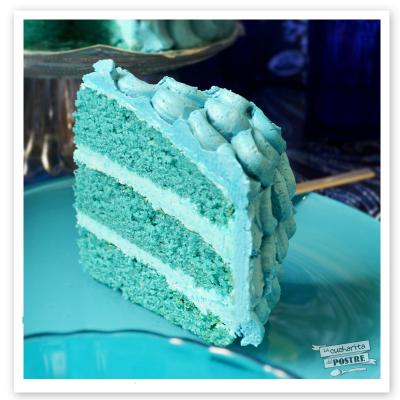 6. Para realizar el buttercream de merengue suizo: separa las yemas de las claras. Pon las claras a calentar al baño María con el azúcar con cuidado de que no cuajen. Cuando se haya disuelto el azúcar, monta las claras hasta conseguir un merengue. Añade por último la mantequilla y bate a velocidad media-alta hasta conseguir una crema sedosa y firme. Separa la crema en dos y tiñe con dos tonos diferentes de azul.