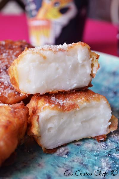 Una vez ha enfriado, cortamos cuadrados con un cuchillo y los pasamos por harina y huevo. Freímos con abundante aceite caliente. Ponemos los cuadrados sobre papel absorbente para que elimine el aceite.