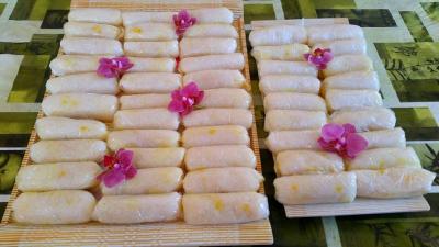 Cortar unos 25 papeles de celofán transparente de unos 25 por 30 cm. Ahora coger con una cuchara grande una porción de arroz, y lo aplastas encima de un papel celofán. Poner un poco de relleno de pollo encima, y con el papel de celofán vas enrollando hasta conseguir como una croqueta grande. Al principio cuesta un poco, si no, puedes mirar un vídeo en YouTube, para ver cómo se hace. Mirar: Lemper rollen. Estos rollos de lempers se pueden congelar y calentar otra vez en el microondas