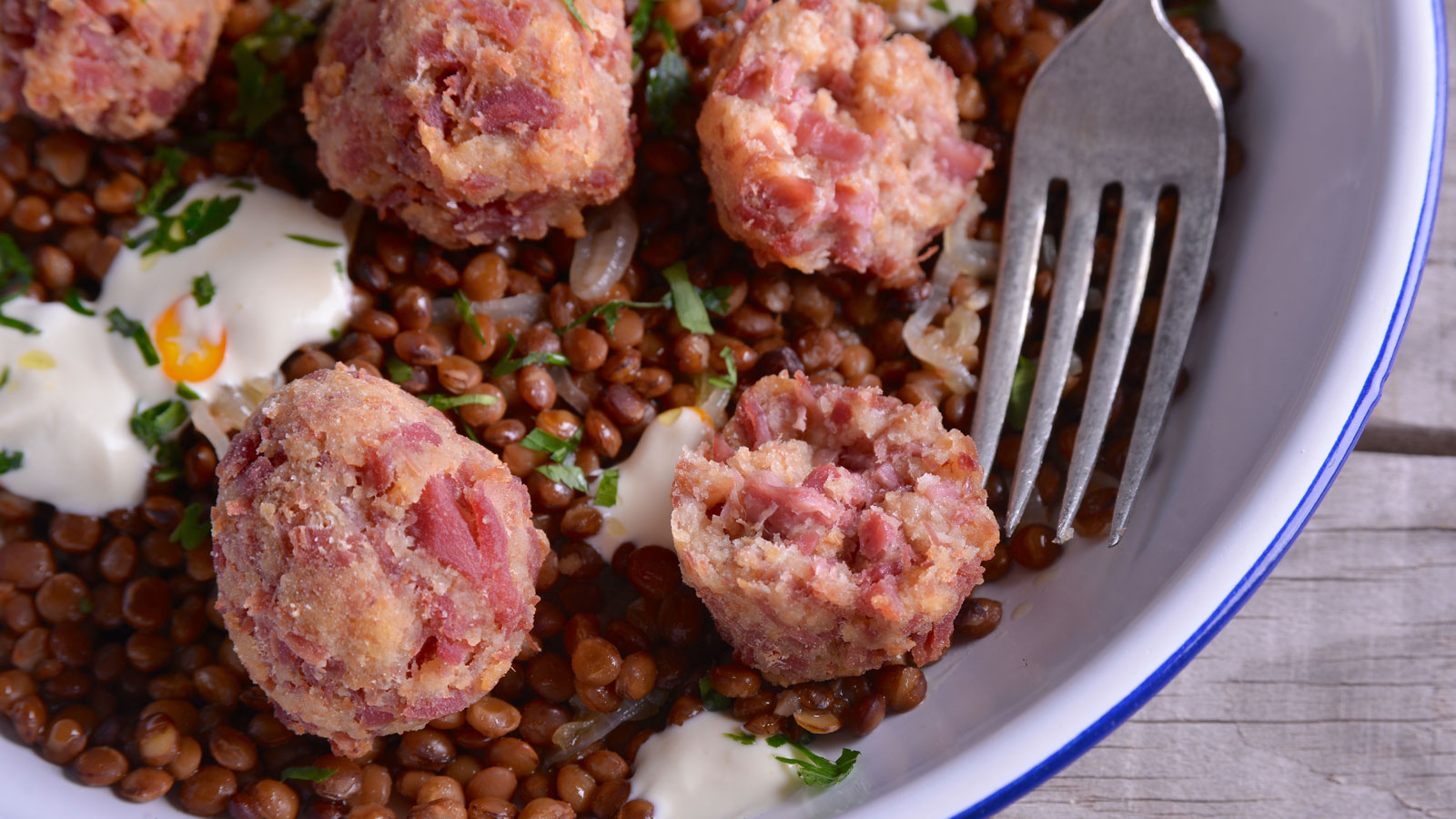 Montamos sobre un plato hondo cubriendo el fondo con las lentejas y rematamos con las bolitas de carne de pato y un chorro de crema agria.