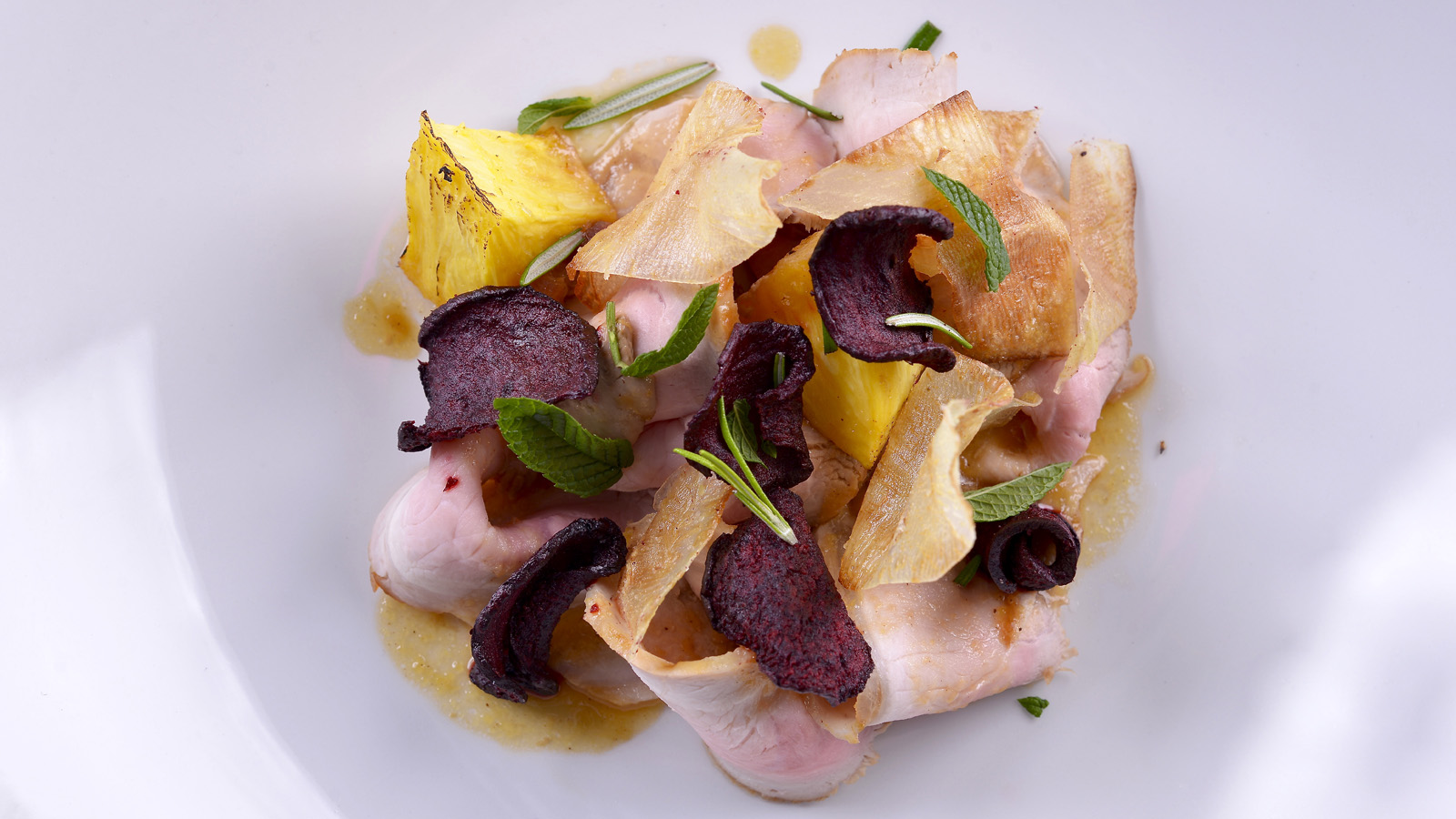 Servimos el lomo fileteado y acompañamos con los chips de yuca y remolacha y acompañamos con la piña y 1 ramita de romero.