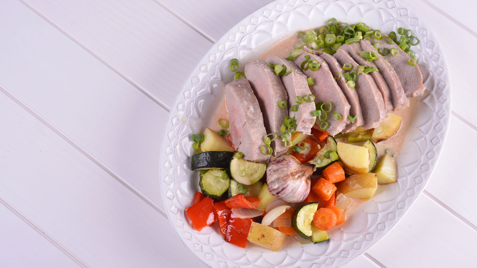 Lomo de cerdo a la sal con crema de ajos