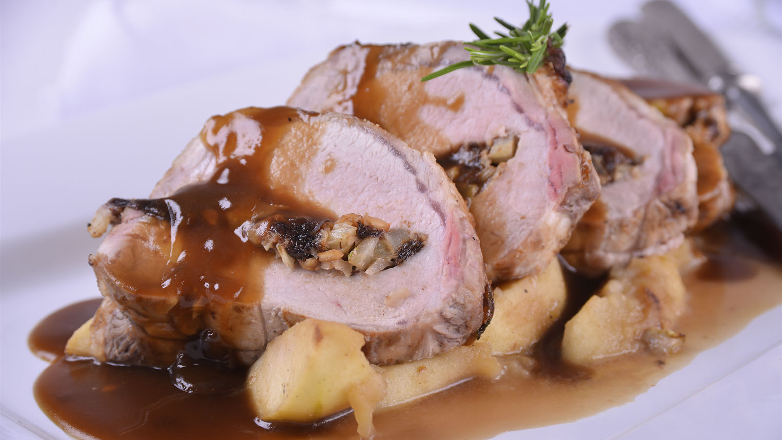 Emplatamos un trozo del lomo con las manzanas asadas y regamos con nuestra salsa por encima. Decoramos con romero y servimos.