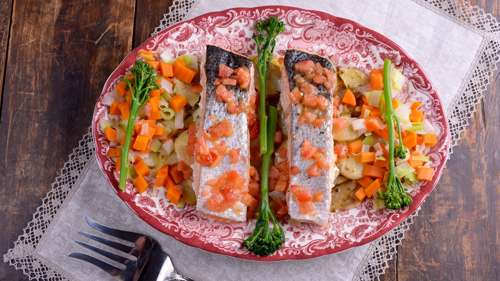 En el capítulo 14 del programa La abuela Lolita la cocinera Dolores Valcárcel nos ensaña a preparar una receta de Lomo de salmón con patatas, verduras y bimi.
