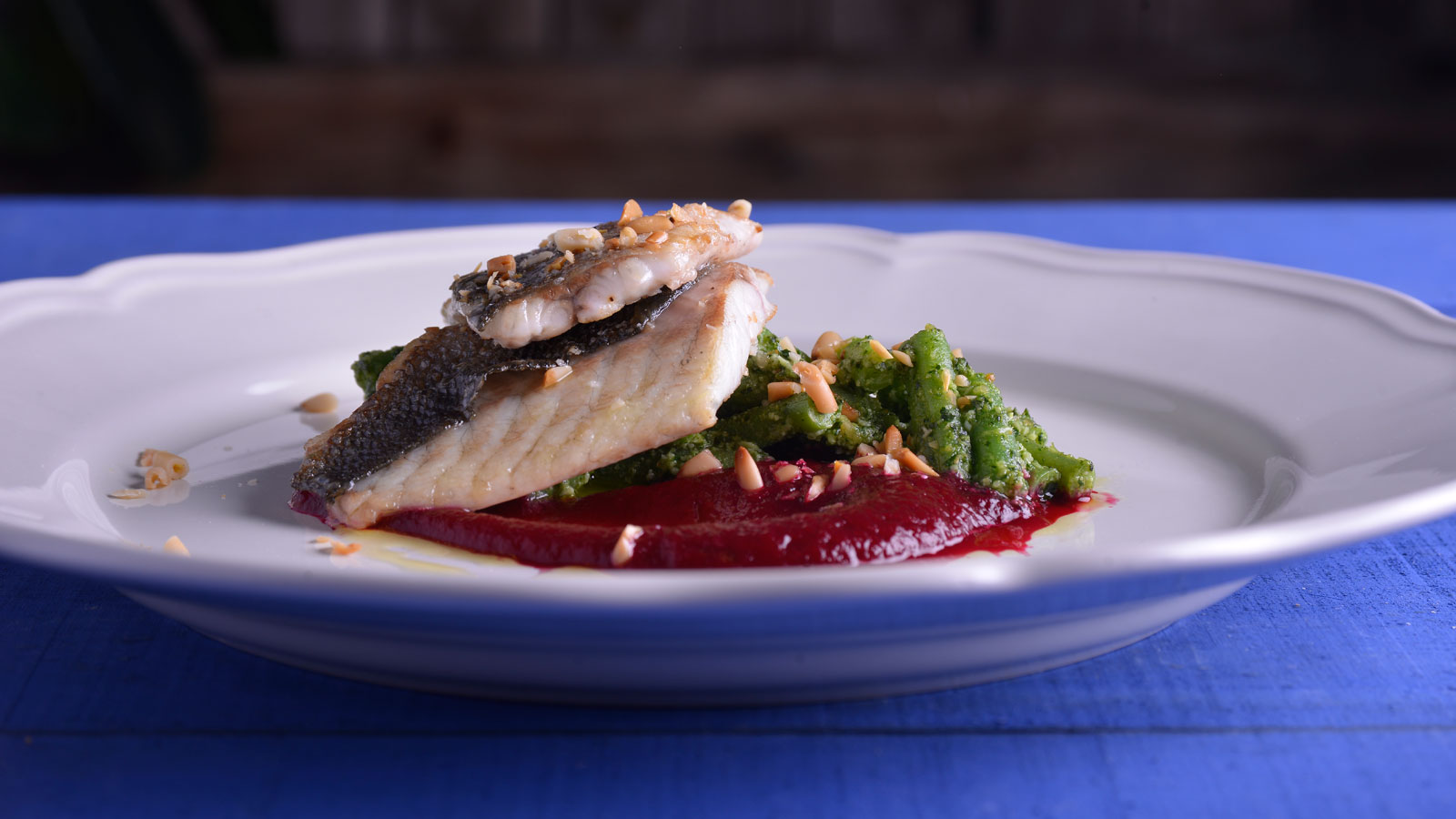 Lubina con pesto y remolacha