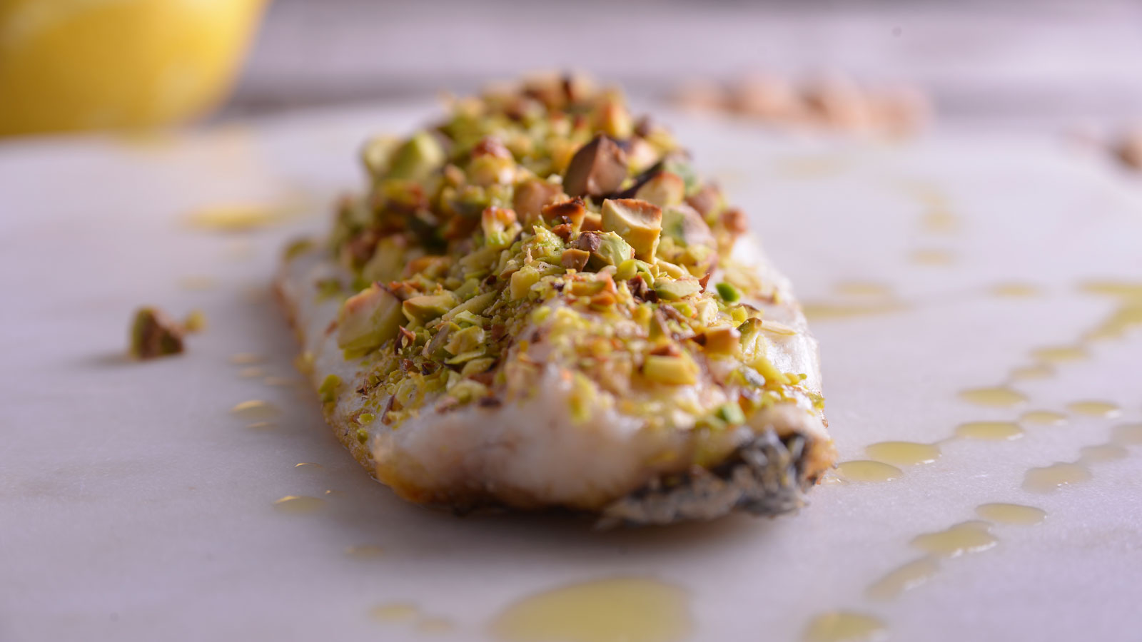 Pasado este tiempo, cubrimos la lubina con pistachos picados y un toque de ralladura de limón. Vertemos también un hilito de aceite de oliva virgen y una pizca de sal.
