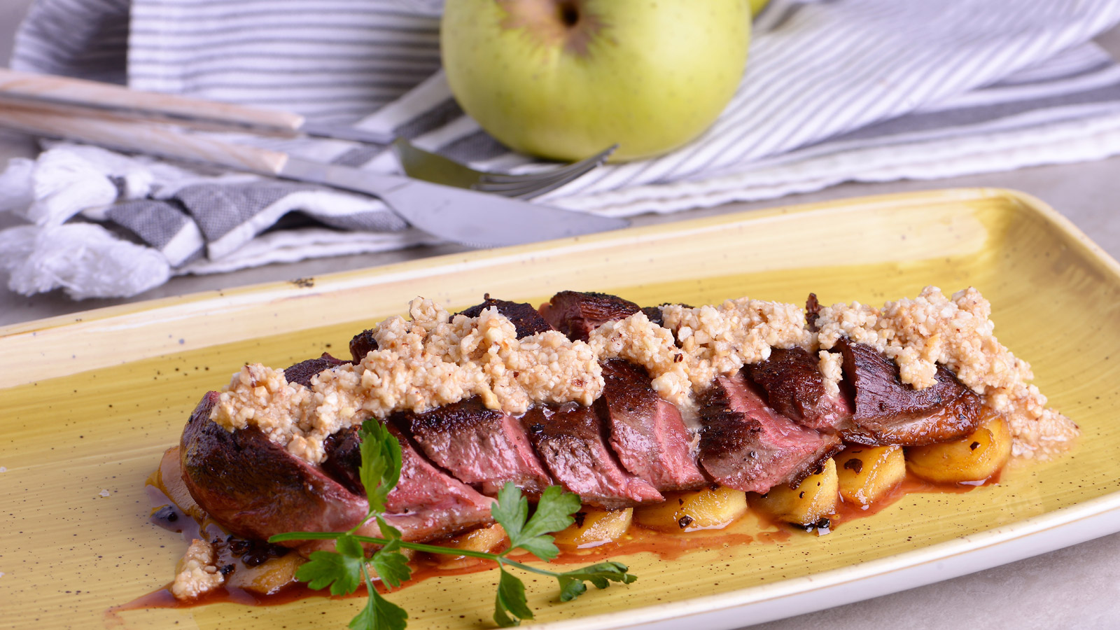 Sobre la manzana, colocamos los filetes de magret de pato, los salseamos con las avellanas y servimos.