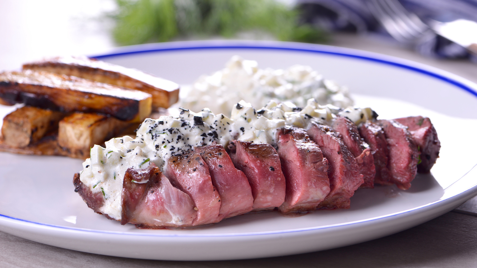 Servimos el magret fileteado con el tzatziki por encima y la berenjena de guarnición.