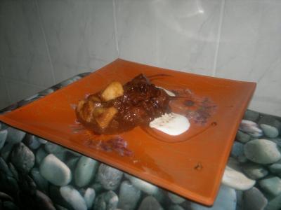 Ponemos en una cacerola aceite y la mitad de la mantequilla y sofreimos el magro previamente salpimentado, cuando este doradito añadimos la cebolla picada finita, cuando se haya quedado dorada la cebolla, añadimos el caldo de pollo y el vino y dejamos cocer hasta que este bien blandita la carne, después le añadimos el chocolate, el yogur, dejando dos cucharaditas para decorar, y una gotas de tabasco, cocemos hasta que se deshaga bien el chocolate sin dejar hervir. Sacamos a los platos o una fuente y en la misma cacerola sin lavarla añadimos el resto de la mantequilla y doramos la manzana en cuadraditos, se la añadimos a la carne y listo. batimos bien el yogur que reservamos antes y ponemos un poquito en cada plato.