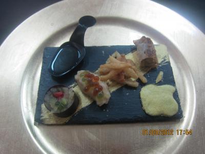 hacemos una bola de compota de manzana y decoramos con esferificaciones de manzana, imitando al nigiri.