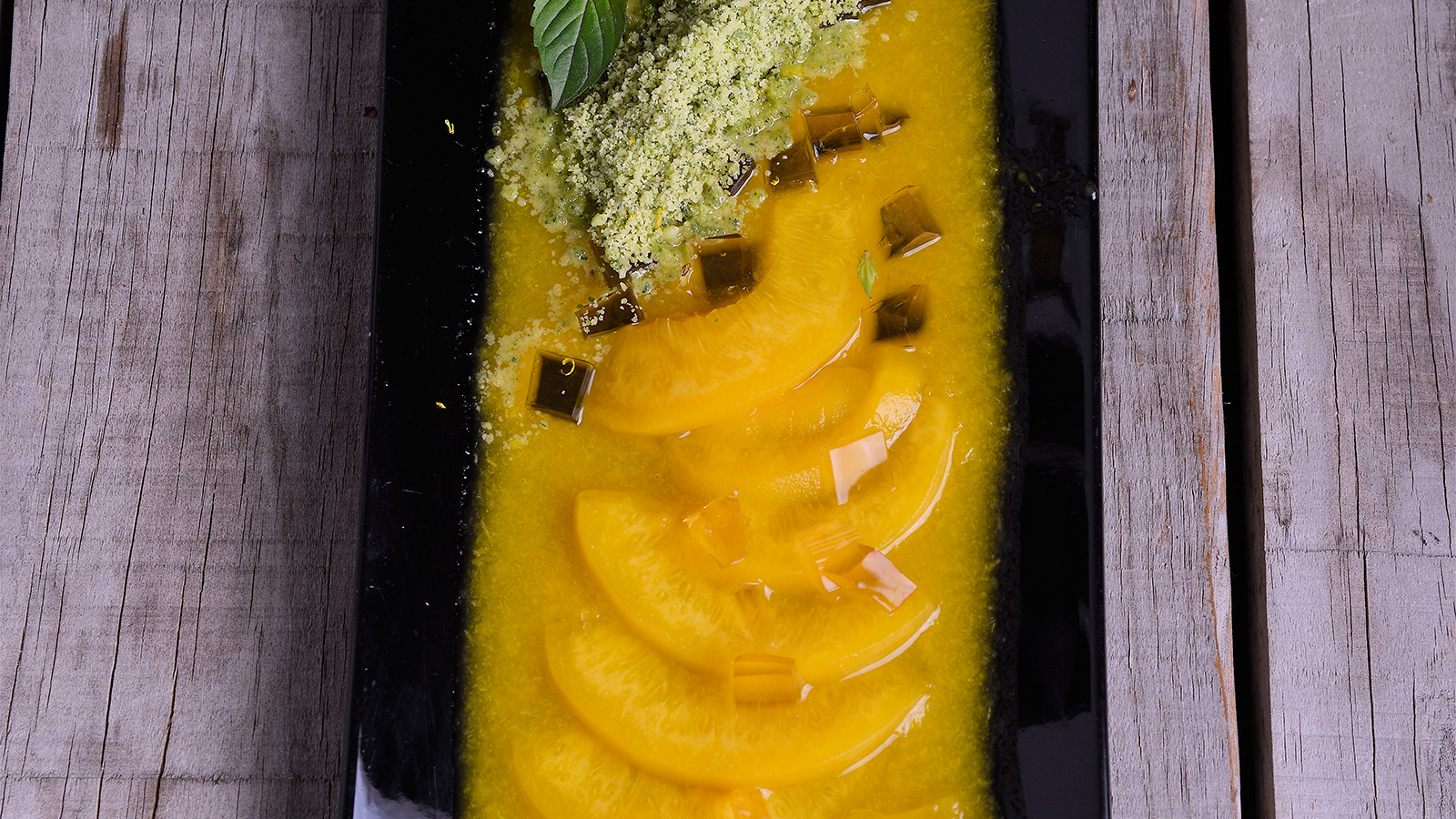 Mazapán de albahaca con gelatina de té y melocotón