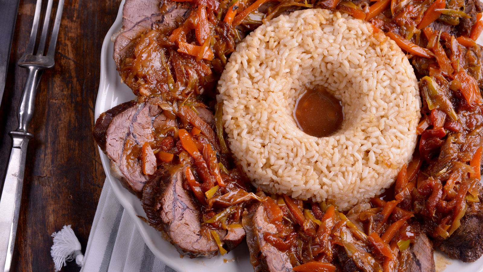 Disponemos de un molde en forma de aro y lo rellenamos con el arroz. Volcamos el molde sobre una fuente redonda. Retiramos la cuerda del morcillo y lo cortamos en rodajas gruesas. Colocamos las rodajas alrededor del aro de arroz.