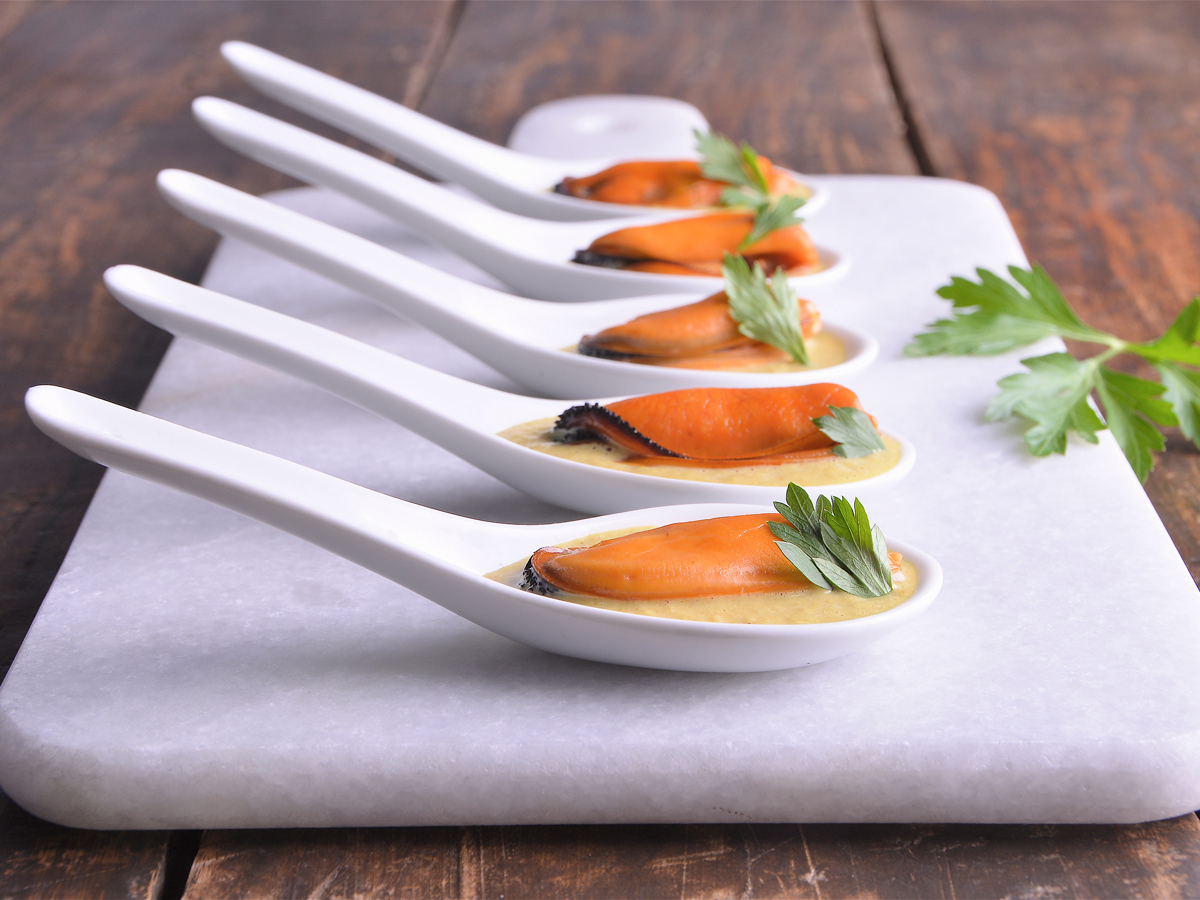 Emplatamos la salsa de curry con mejillones y terminamos con los otros mejillones enteros.