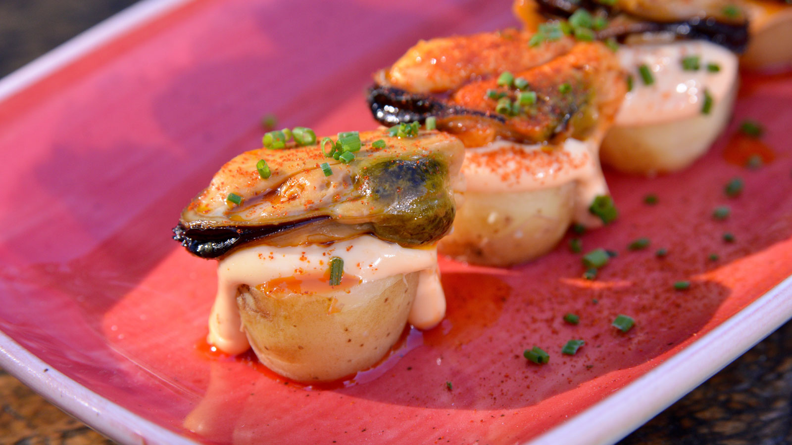 Para emplatar, disponemos de un plato hondo, colocamos las patatas cocidas en la base con una cucharada del caldo del mejillón. Incorporamos el alioli y terminamos cubriendo con los mejillones.