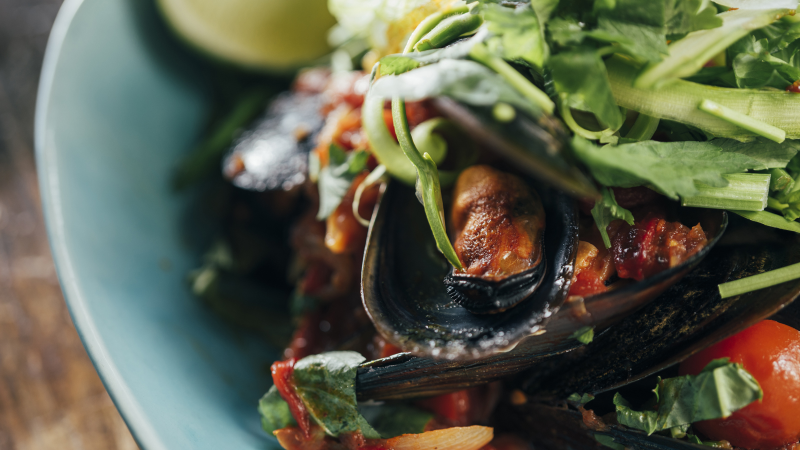 Servimos los mejillones, espolvoreamos con las hierbas picadas y decoramos con un poco de lima.
