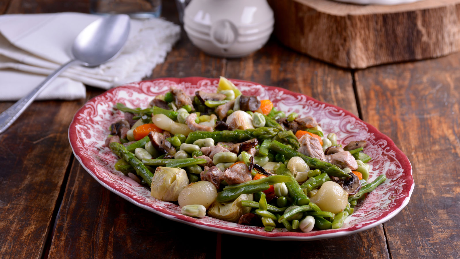 Retiramos del fuego y servimos nuestra deliciosa menestra de verduras.