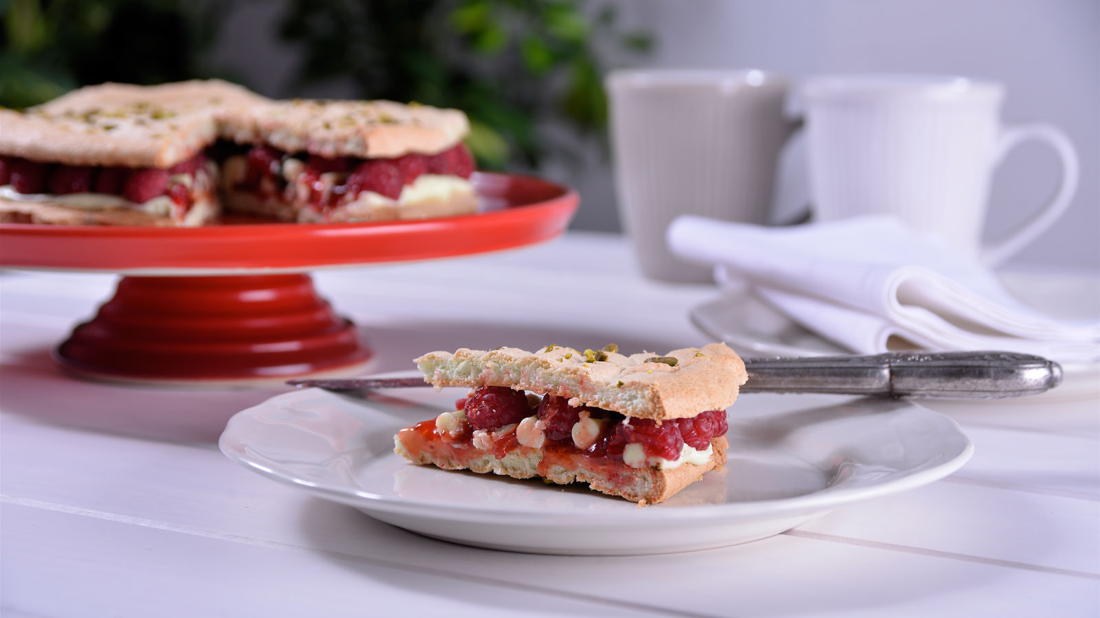 Cuando los discos estén hechos y fríos ponemos círculos de crema de pistachos con la ayuda de una manga pastelera y encima pegamos una hilera de frambuesas. En el centro, pondremos la mermelada y el resto de las frambuesas.