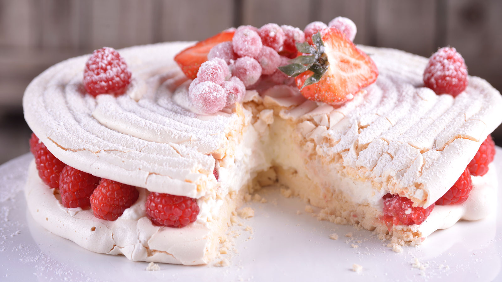 Tarta de merengue relleno de nata y frambuesas