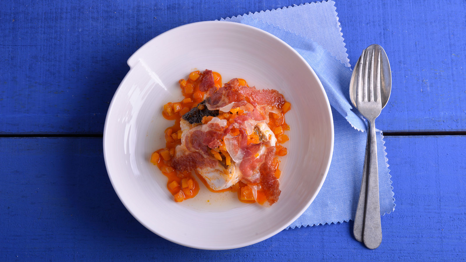 Merluza con calabaza crujiente de jamón y aceite de pimentón