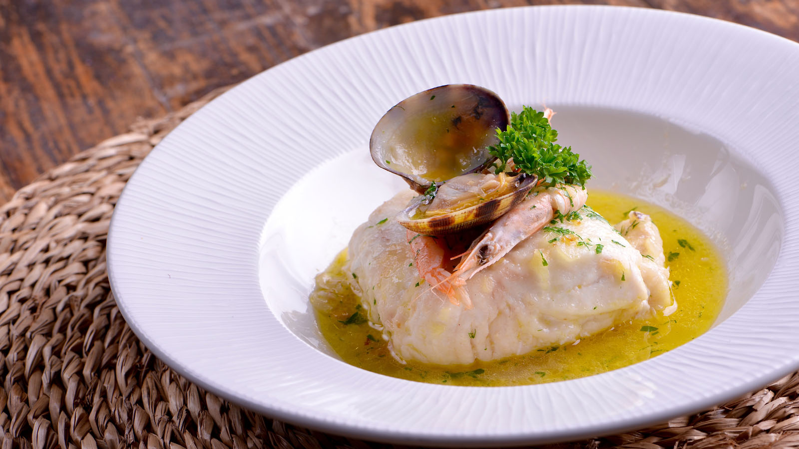Merluza con salsa de gambas y almejas