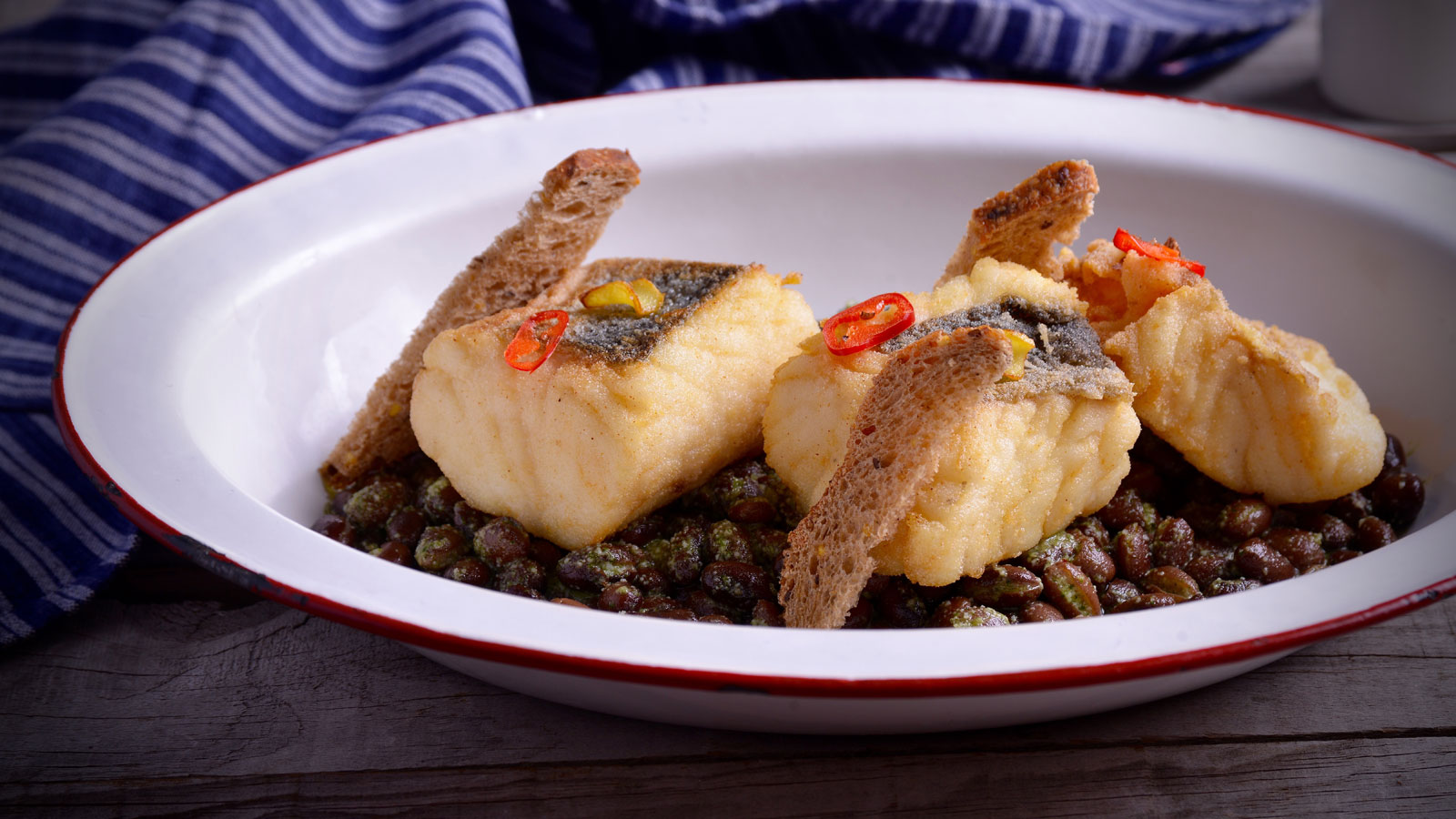 Merluza frita sobre alubias negras aliñadas con pesto de cilantro
