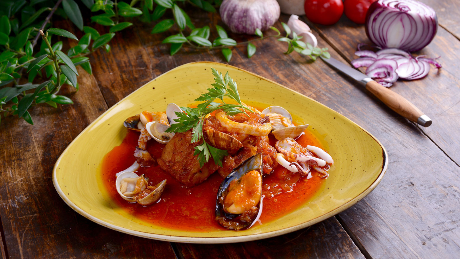 Para finalizar, servimos el mero frito con un poco de salsa, pulpo, mejillones, calamares y almejas. Podemos acompañarlo con un bol de arroz blanco cocido o rebanadas de pan.