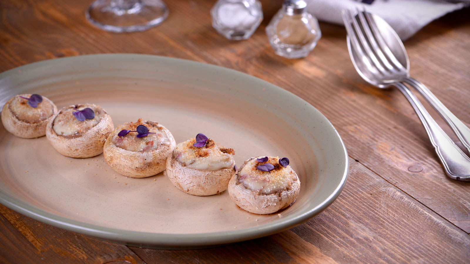 Mi versión favorita de una croqueta: champiñones rellenos de bechamel de jamón y gratinados con pan rallado