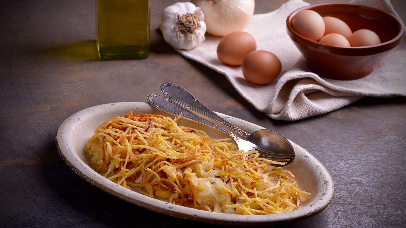 Migas de bacalao con cebolla y patatas paja