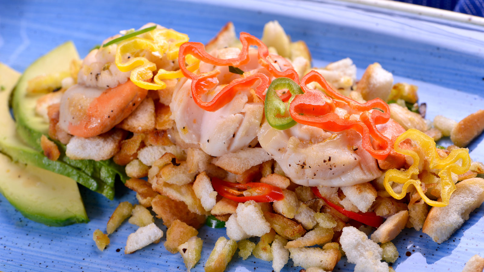 Ponemos una base de aguacate en el plato, encima las migas, las vieiras y, por último, los chiles en crudo con sal de limón por encima.