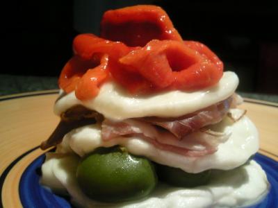 Milhojas de mozzarella con aceitunas, jamon y pimenton