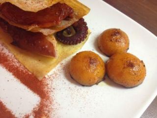 Milhojas de pulpo con tomates desidratados