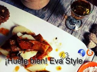 5.- Colocamos una capa de papas sobre el plato, encima de ellas ponemos la salsa con los tollos. Repetimos la operación una vez más. Al final sobre los tollos colocamos un dientes de ajo cocinada.
