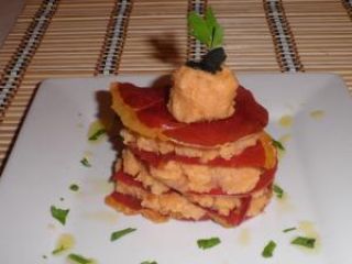 Jamón iberico, tomate, cebolleta, pimiento, pan, ajo, aceite, sal, pimienta