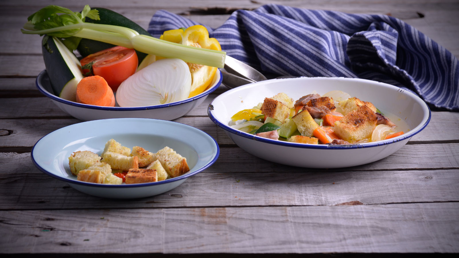 Emplatamos el minestrone acompañado por el bacalao ahumado, el arenque y el pan tostado.