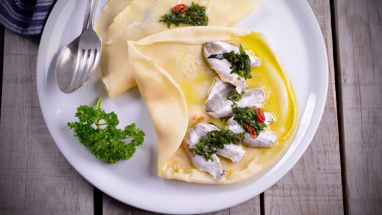 Emplatamos nuestros crepes de cocochas y servimos rociando unas gotas de la salsa verde que hemos preparado anteriormente.