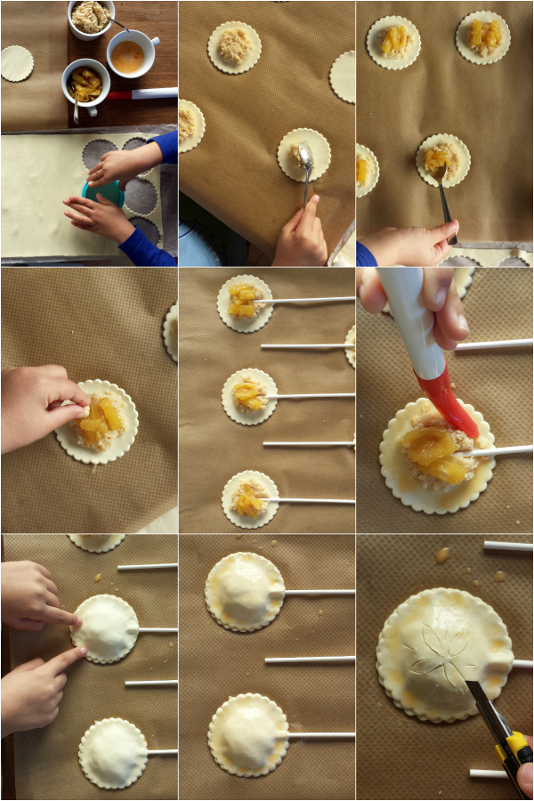 ***he decidido quitar los palitos de piruleta porque en algunas de las galettes me parecían inestables. Puedes intentar poner los palitos un poco más arriba antes de cerrar las galettes o prescindir de ellos.