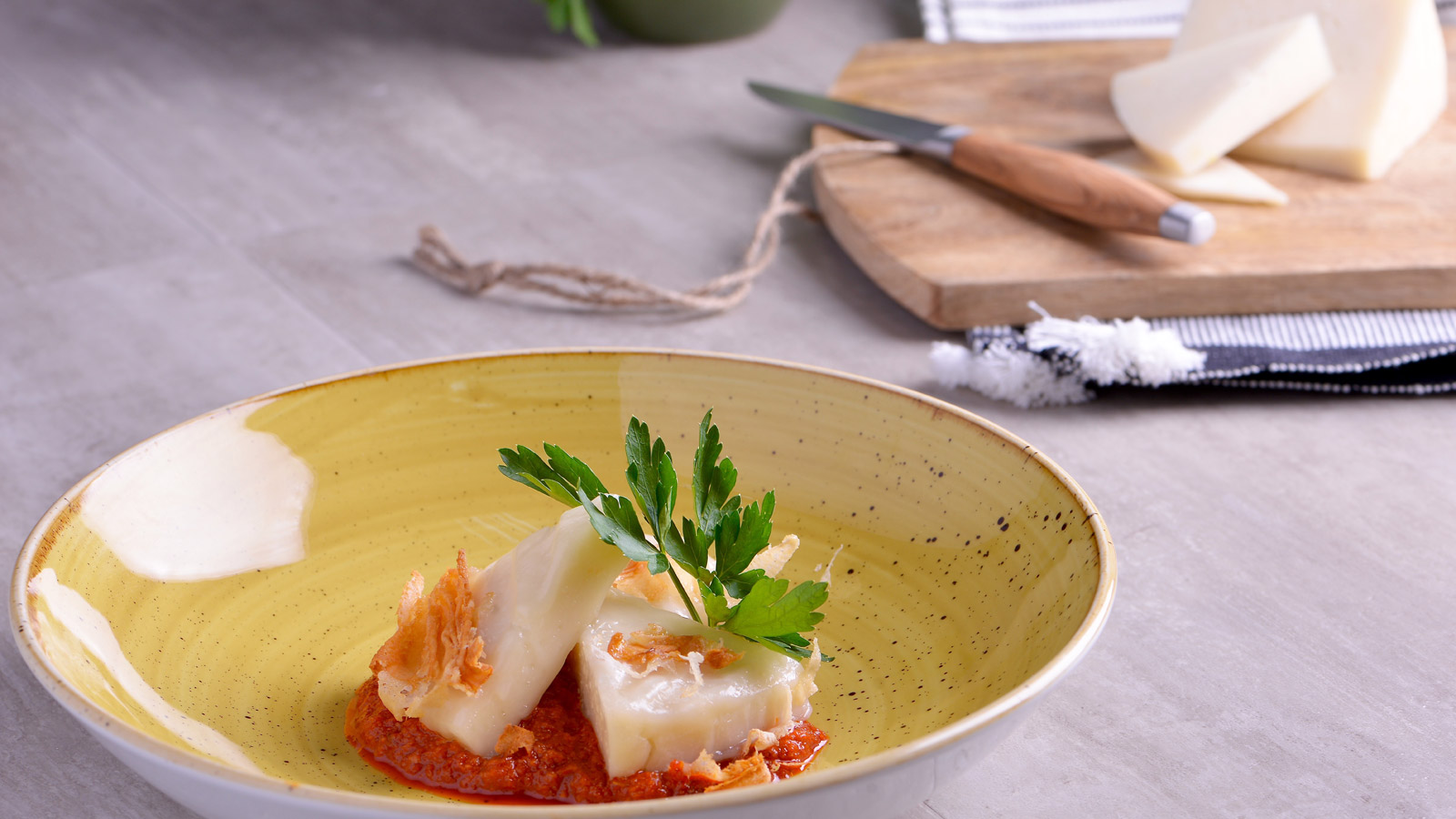 Por último, troceamos 200 g de queso canario, y lo pasamos por la plancha para dorarlo ligeramente por fuera.
