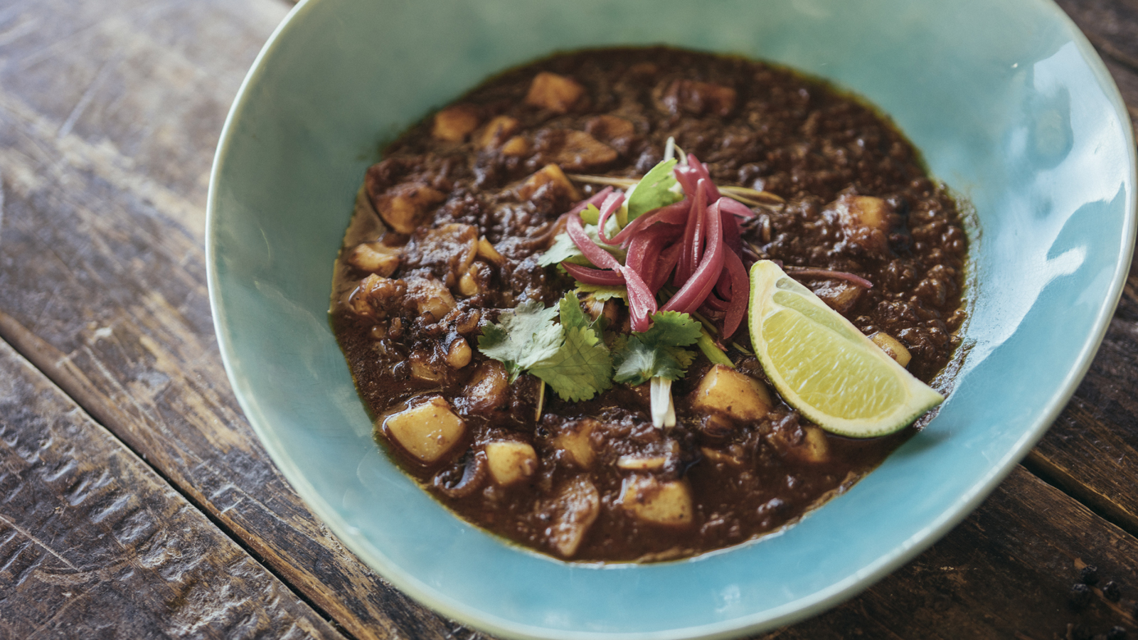 Servimos con cebolleta picada en juliana, hojas de cilantro, cebolla morada encurtida y un gajo de lima.