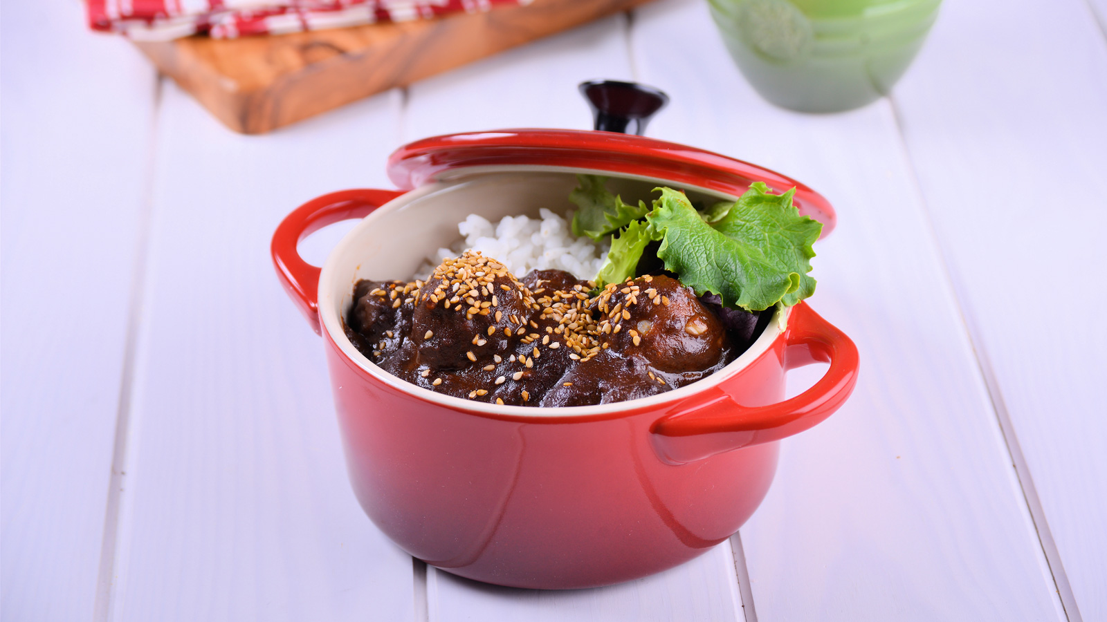 Cocemos las albóndigas en la olla con el mole durante 10 minutos aproximadamente o hasta que estén cocidas.