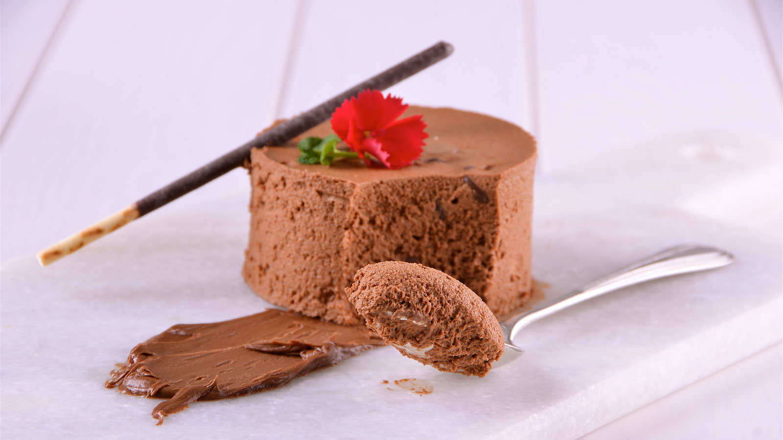 Retiramos de la nevera y desmoldamos. Disponemos en la base de un plato un poco de crema de chocolate y avellanas, colocamos la mousse al lado y decoramos con las flores y los palitos de chocolate.