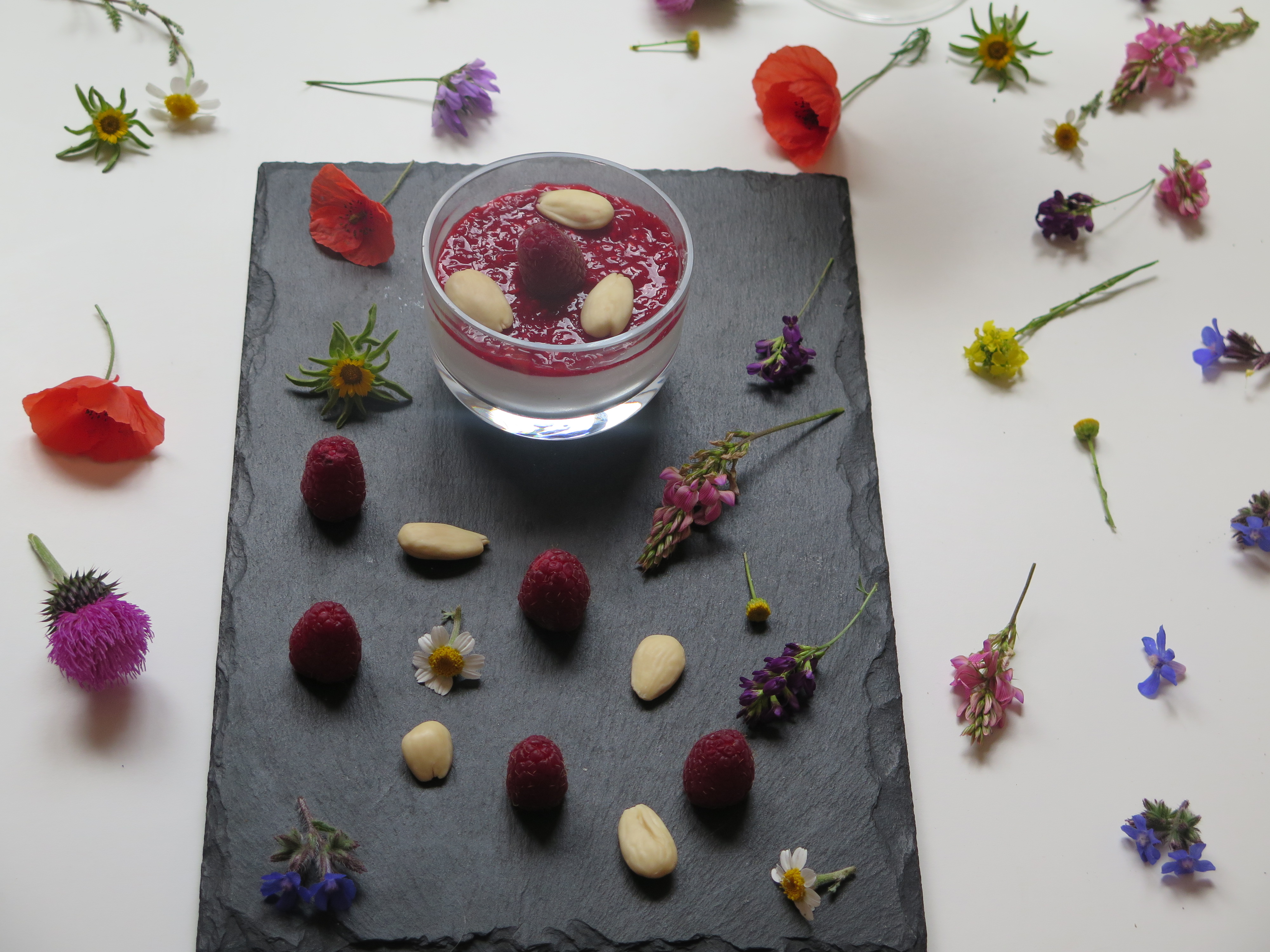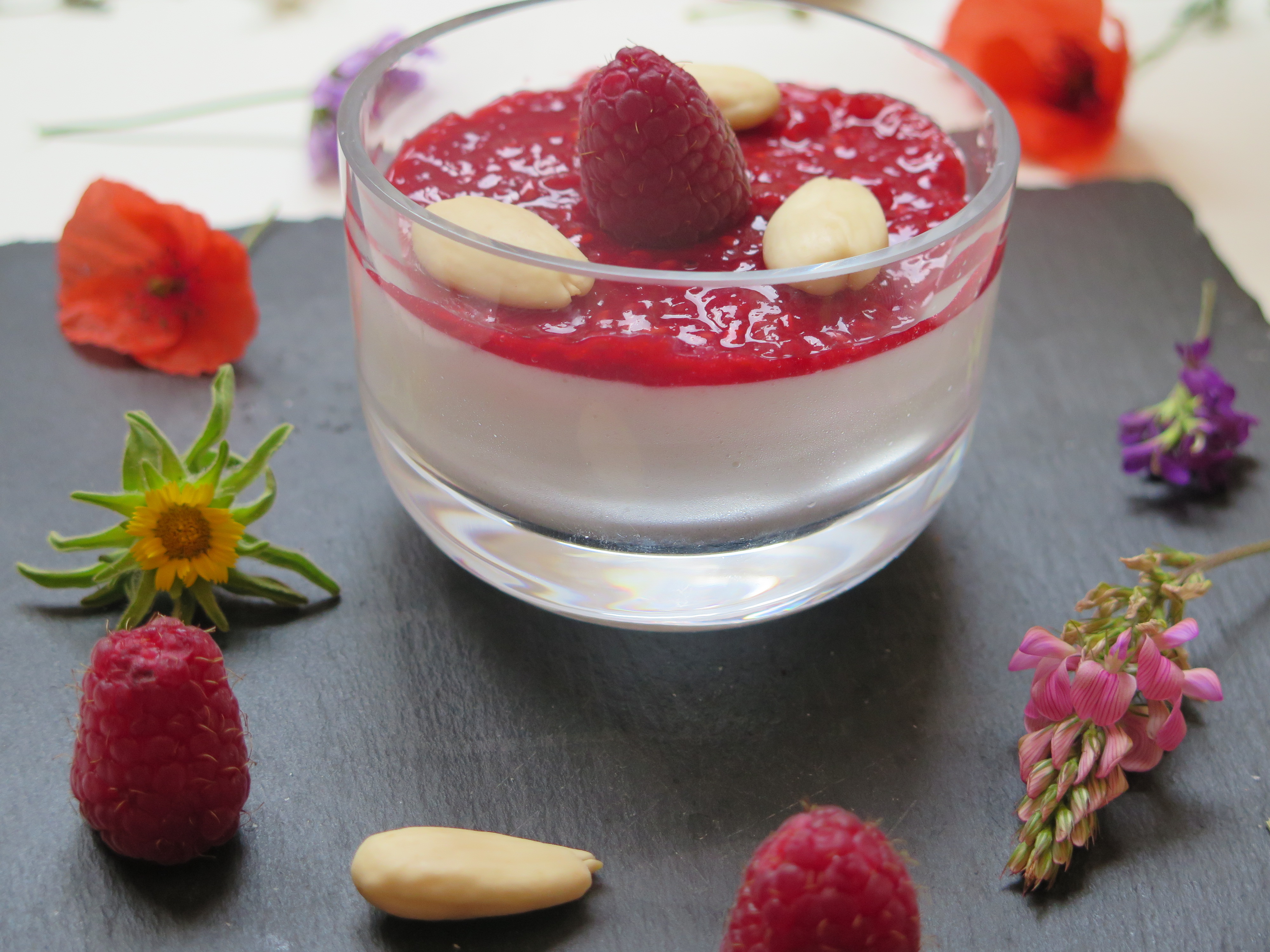 Mousse de leche de almendra con mermelada de frambuesa